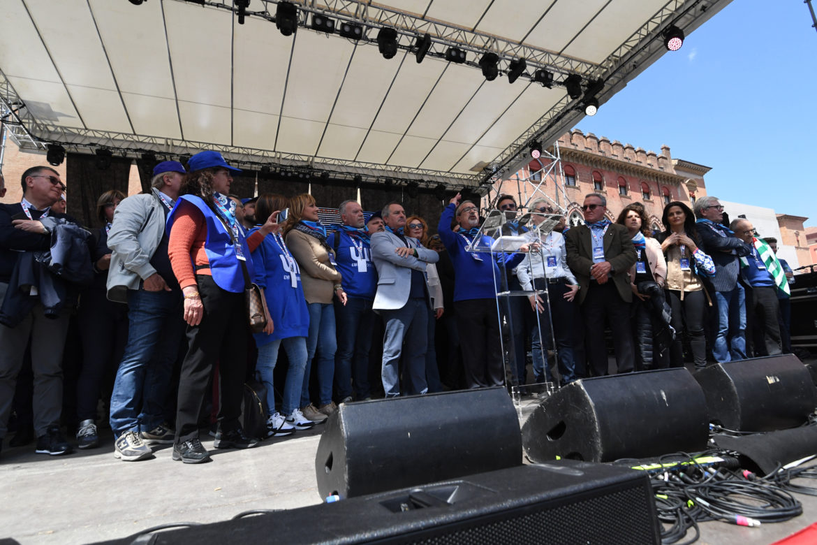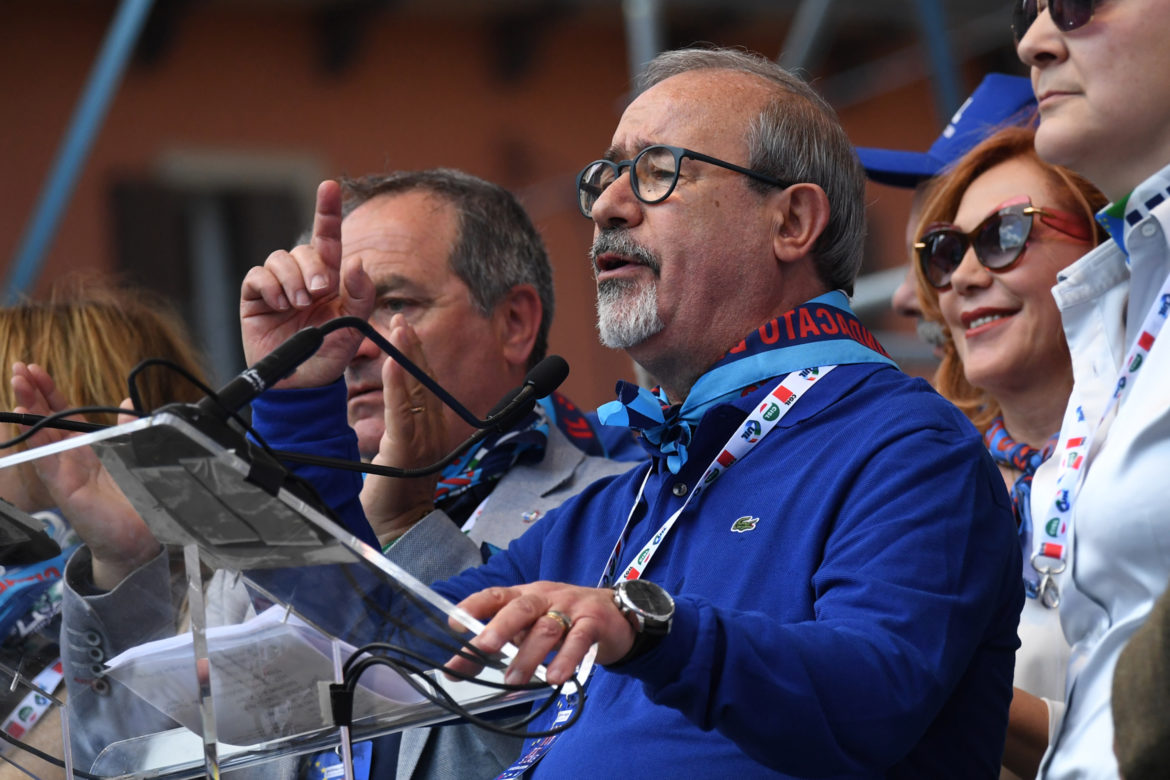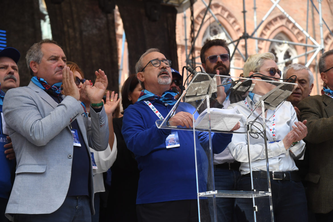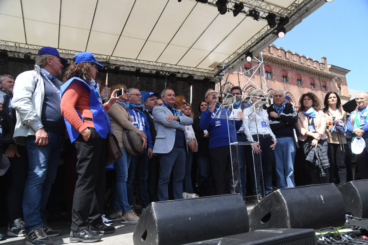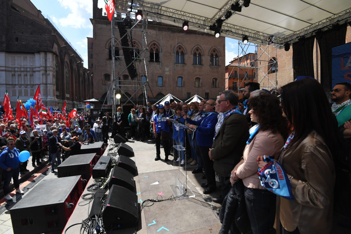 Dobbiamo insediare una commissione costituente per l’unità sindacale: basta parole, bisogna passare ai fatti”. È uno dei passaggi centrali del comizio per il Primo Maggio del Segretario generale della Uil, Carmelo Barbagallo, da Piazza Maggiore a Bologna. (Foto: Gianni Schicchi)
