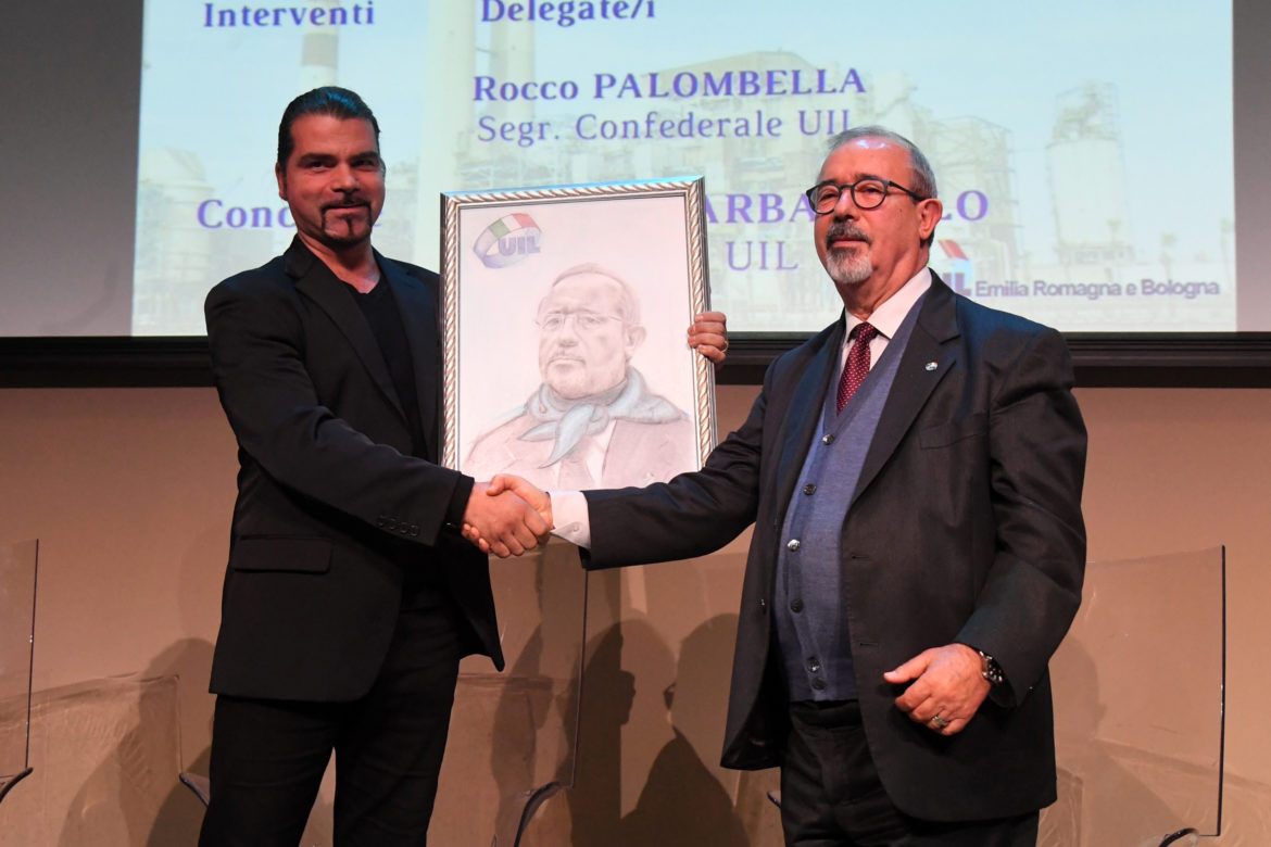La splendida opera dell’artista Alessio Atzeni è stata donata dal segretario generale Uil ER Giuliano Zignani, al segretario Barbagallo
