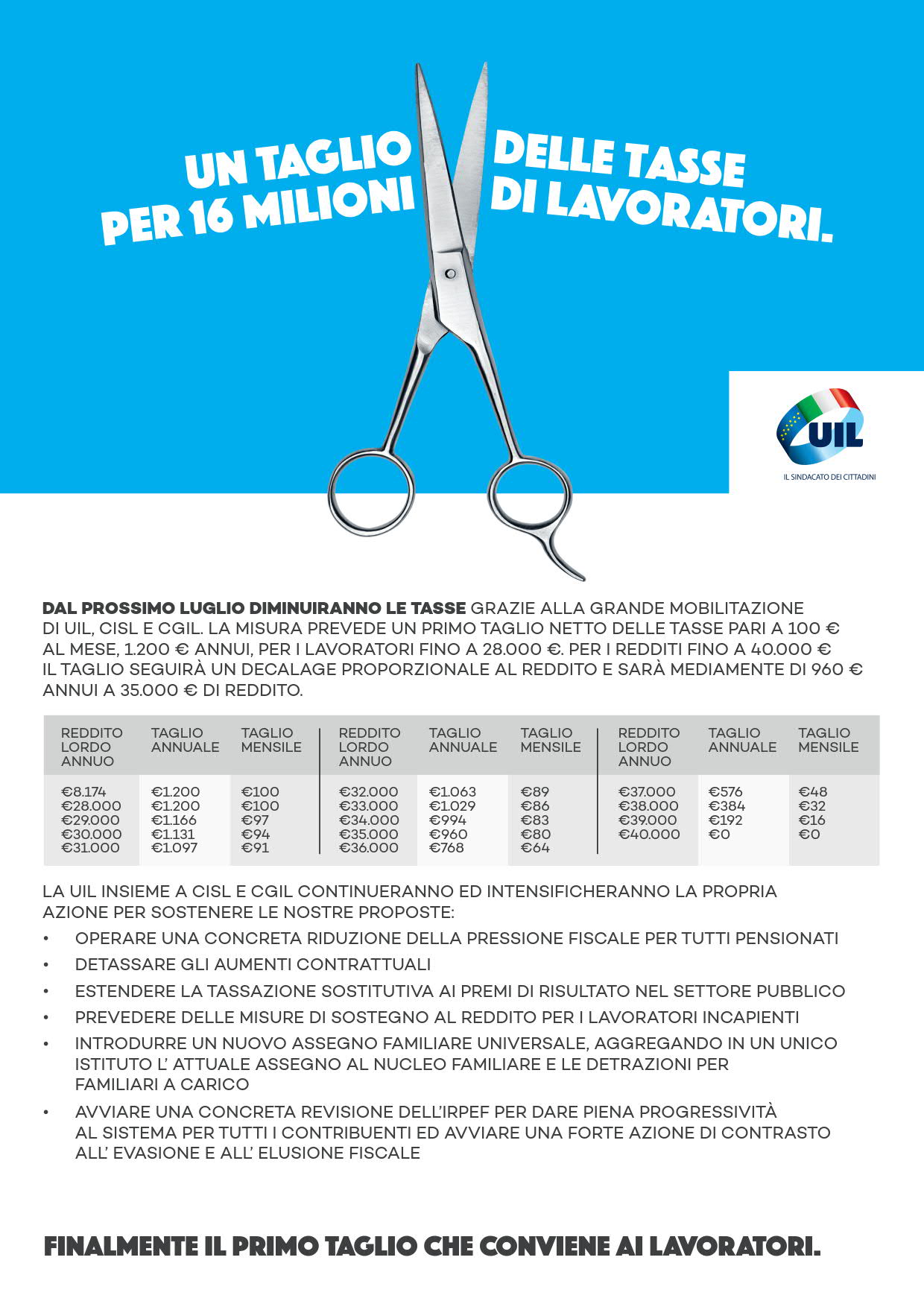 Grazie alla mobilitazione di Cgil-Cisl-Uil, da luglio taglio netto delle tasse di 100 euro per i lavoratori con un reddito fino a 28mila euro! Per i redditi fino a 40mila euro, il taglio sarà, in modo proporzionale, a scalare.