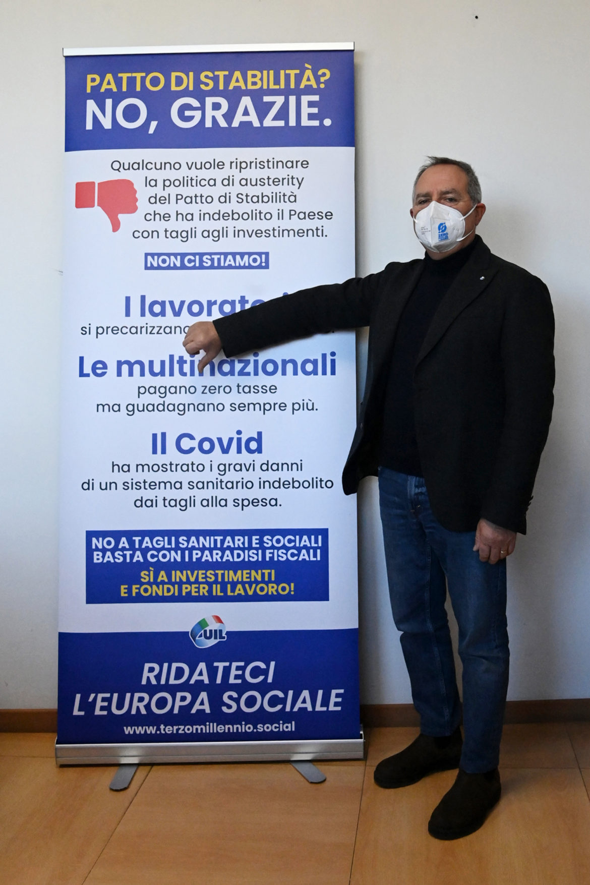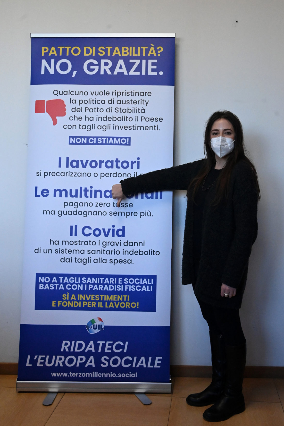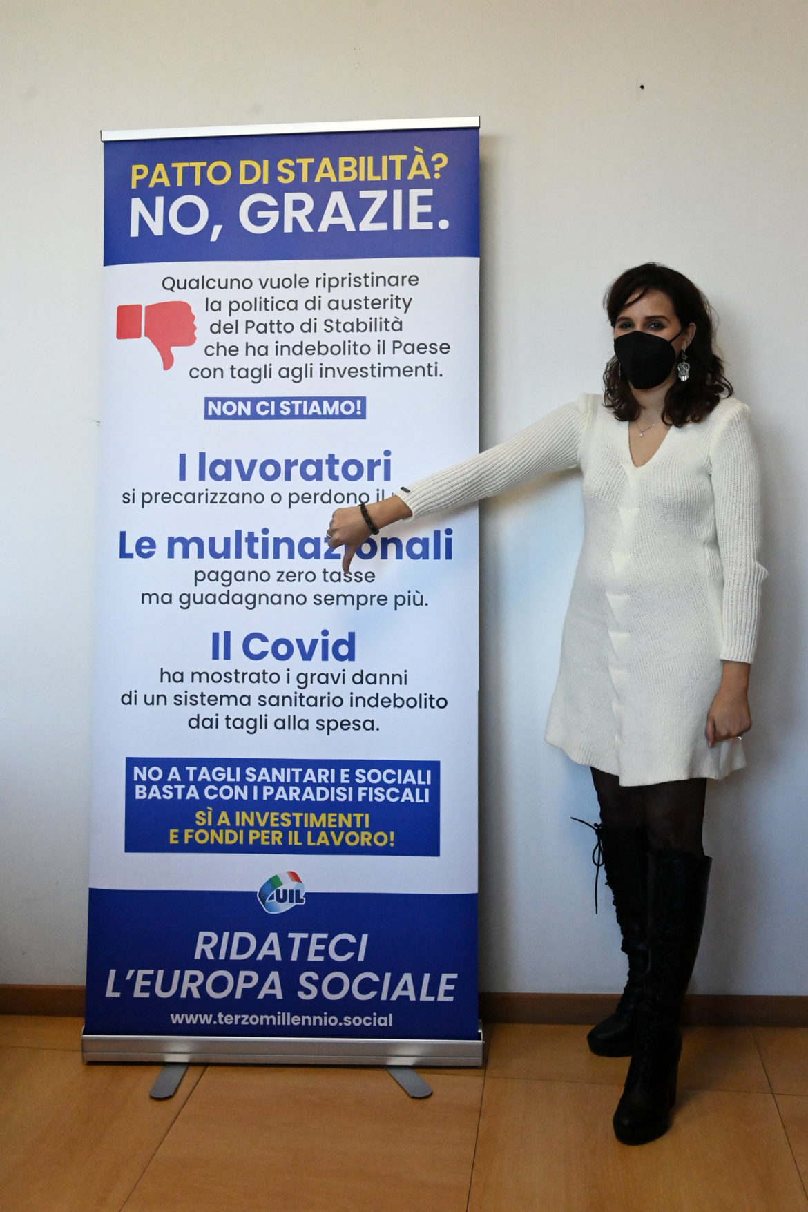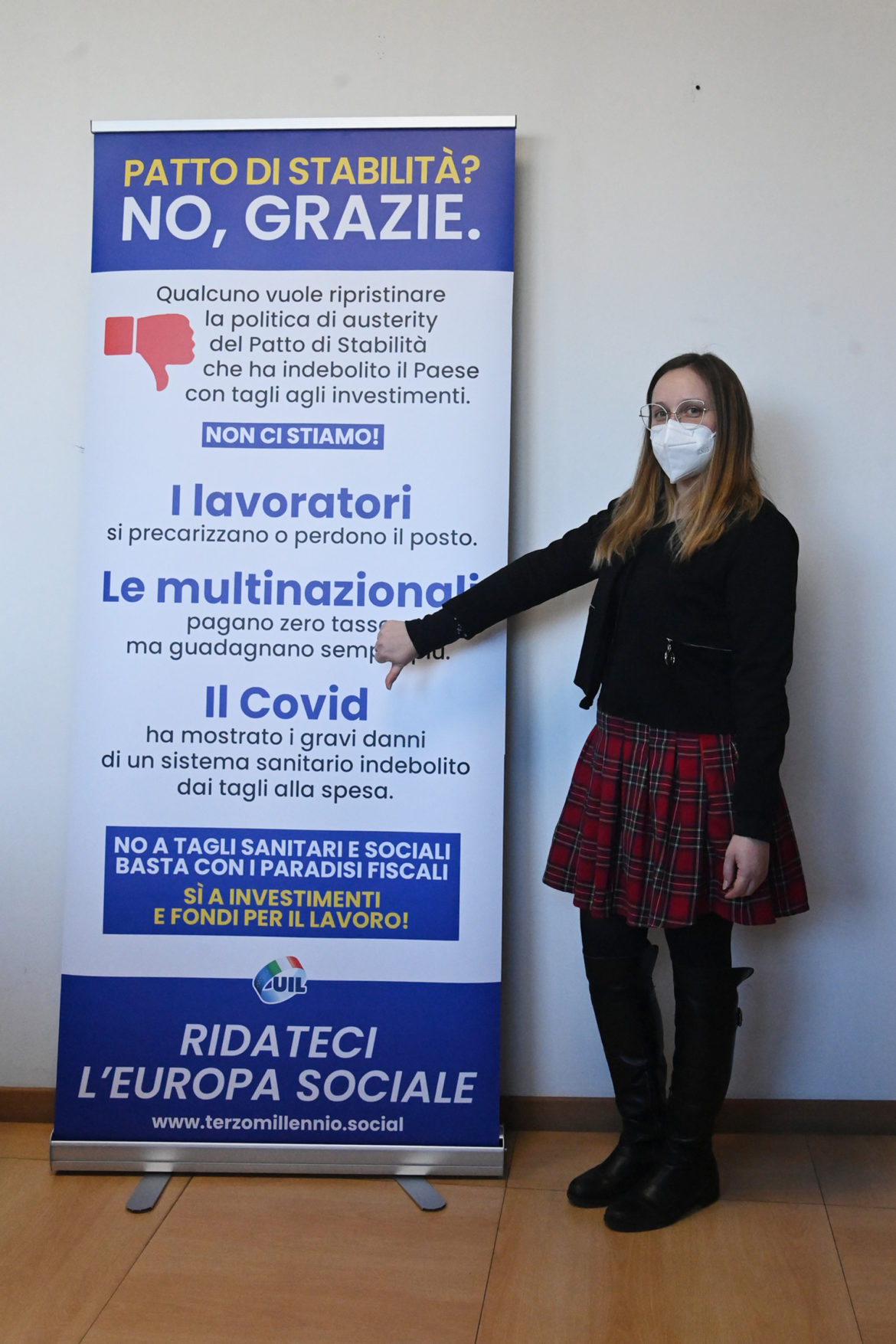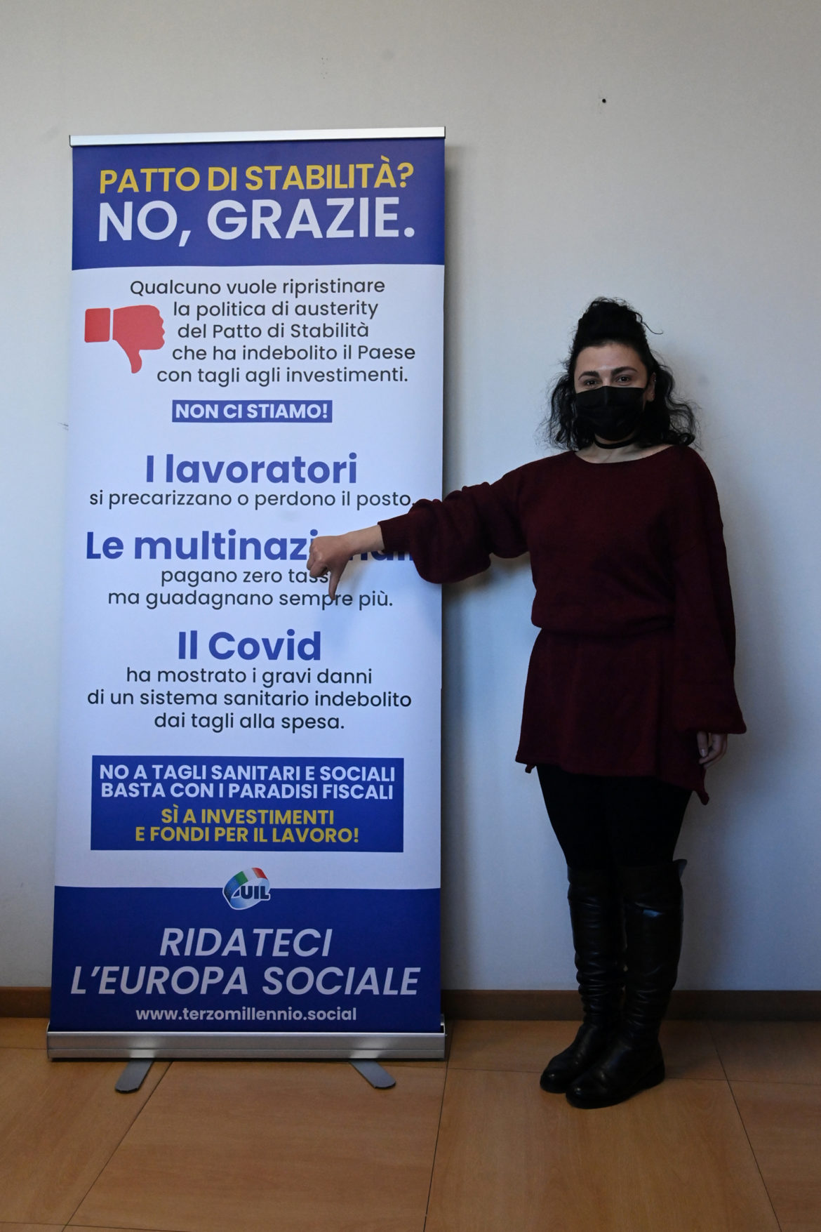 Il segretario generale UIL ER, Giuliano Zignani, insieme a Valentina, Luana, Erisa e Ilaria, aderisce alla camapagna della UIL per dire #NoPattoStabilità
