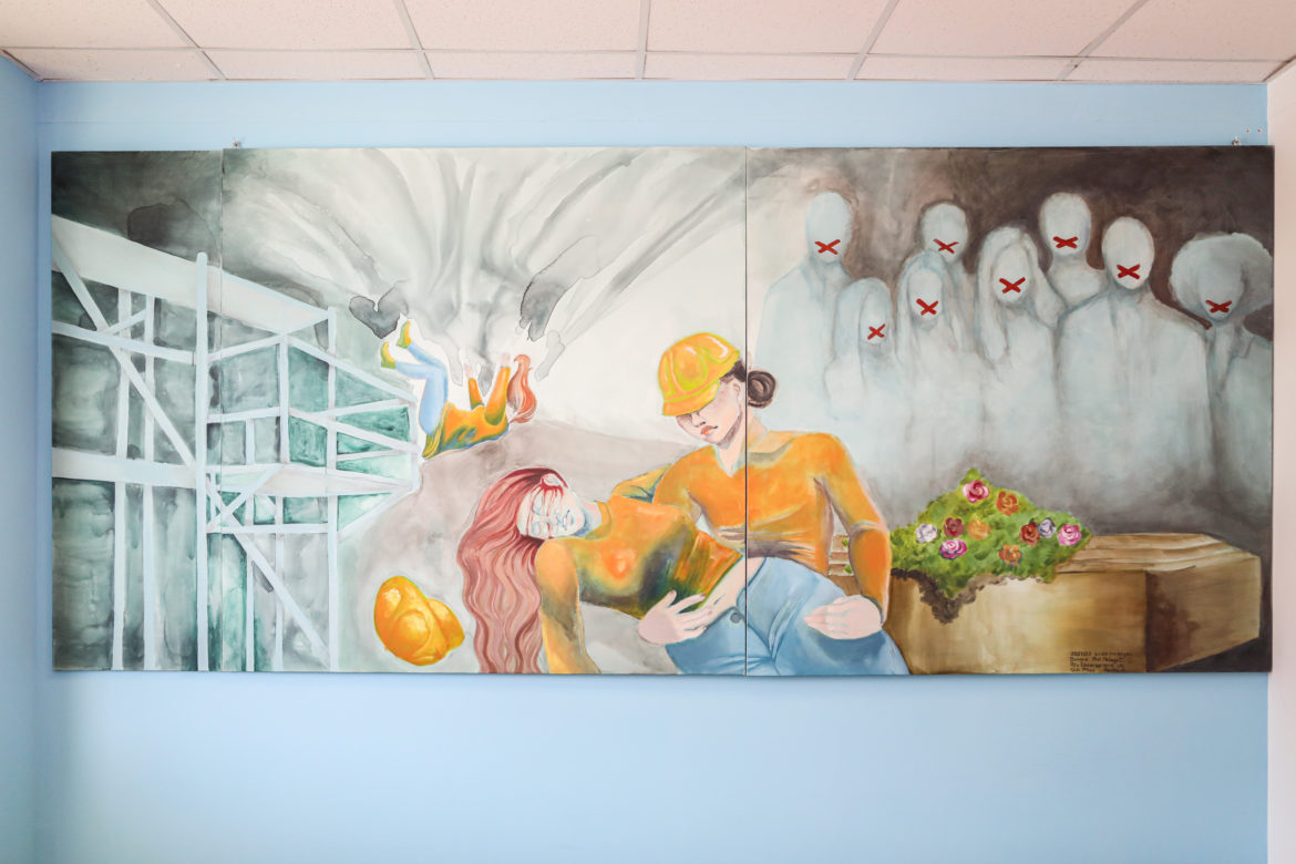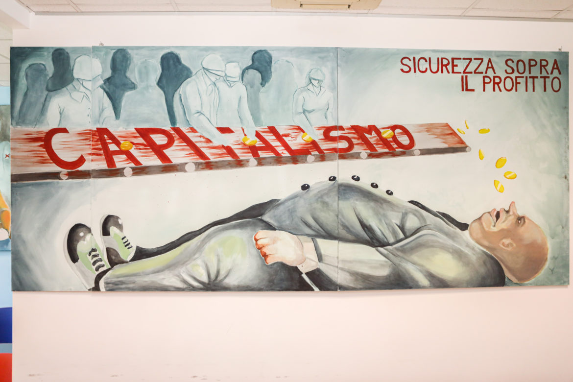 «Il progetto – spiega Dante Pelagatti, professore di Pittura che ha seguito tutte le fasi esecutive dell’opera – è stato realizzato nell’arco di circa 3mesi e mezzo su una tematica di estrema attualità. Nella fase progettuale, ciascuno studente ha realizzato la sua proposta creativa su carta di circa cm.30×70 partendo dalla suddivisione in 2 parti, parete A scena dell’incidente; parete B scena della critica a un certo capitalismo selvaggio e ipotesi di soluzioni. Molti studi preliminari, varie le tecniche utilizzate. Il tema non era facile da raccontare, si poteva cadere nella facile retorica».