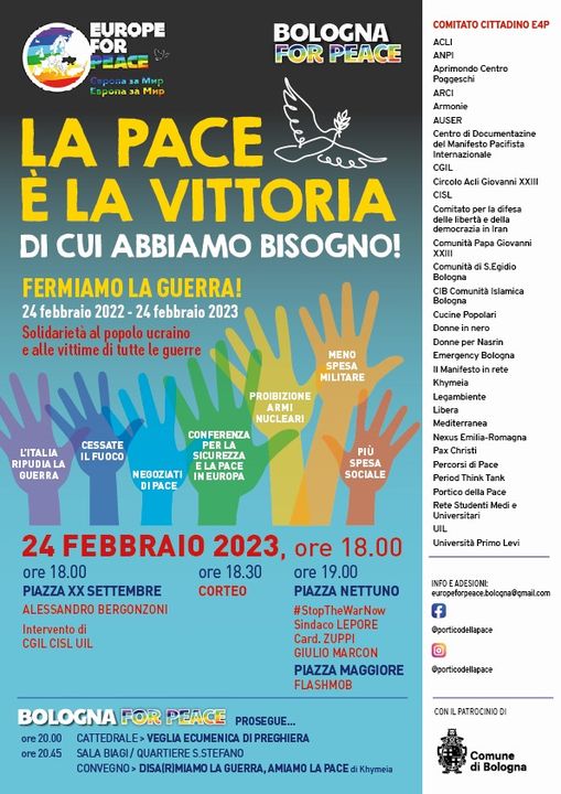 A Bologna il 24 febbraio a partire dalleore 18 da piazza XX Settembre, dopo l’intervento di CGIL-CISL-UIL, si terrà un corteo multiforme e intensamente comunicativo fino a piazza Nettuno, dove, alle 19, parleranno il sindaco di Bologna Matteo Lepore, il cardinale Matteo Maria Zuppi presidente della CEI, Giulio Marcon in rappresentanza di Europe for peace Italia e Giampiero Cofano, portavoce di #stopthewarnow, la rete di oltre 150 associazioni impegnate da un anno nelle Carovane di pace in Ucraina. Alessandro Bergonzoni porterà il suo contributo artistico a sostegno della manifestazione, con l’abituale generosità e amicizia.
